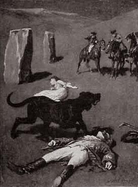 “这帮人勒住了马,可以猜想得到,他们现在已比出发的时候清醒得多了。其中大多数已经不想再前进了,可是有三个胆子最大的——也许是醉得最厉害的——继续策马向山沟走了下去。前面出现了一片宽阔的平地,中间立着两根大石柱——至今还可以看到——是古时不知是谁立起来的。月光把那块空地照得很亮,那因惊恐和疲惫而死的少女就躺在那块空地的中央。可是使这三个胆大包天的酒鬼毛骨悚然的既不是少女的尸体,也不是躺在她近旁的修果·巴斯克维尔的尸体,而是站在修果身旁撕扯着他喉咙的那个可怕的东西,一只既大又黑的畜生,样子象一只猎狗,可是谁也没见过这样大的猎狗。正当他们看着那家伙撕扯修果·巴斯克维尔的喉咙的时候,它把闪亮的眼睛和直流口涎的大嘴向他们转了过来。三个人一看就吓得大叫起来,赶忙拨转马头逃命去了,甚至在穿过沼地的时候还惊呼不已。据说其中的一个因为看到了那家伙当晚就吓死了,另外两个也落得个终身精神失常。
