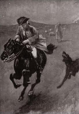 “在他们跑了一二英里路的时候,遇到了一个沼地里的牧人,他们大喊着问他看到了他们所追捕的人没有。据说那牧人当时被吓得简直都说不出话来了,后来,他终于说他确实看到了那个可怜的少女,后面还有一群追索着她的猎狗。‘我看到的还不止这些呢,’他说道,‘修果·巴斯克维尔也骑着他那黑马从这里过去了,还有一只魔鬼似的大猎狗一声不响地跟在他的后面。上帝啊,可别让那样的狗跟在我的后面!’那些醉鬼老爷们骂了那牧人一顿就又骑着马赶了下去。可是不久他们就被吓得浑身发冷了。因为他们听到沼地里传来了马跑的声音,随后就看到了那匹黑马,嘴里流着白沫跑了过去,鞍上无人,缰绳拖在地上。从那时起那些浪子们就都挤到了一起,因为他们已经感到万分恐怖了,可是他们总还是在沼地里前进着。如果他们只是一个人走在那里的话,无疑地早就会拨转马头跑回去了。他们就这样慢慢地骑着前进,最后终于赶上了那群猎狗。这些狗虽然都是以骁勇和优种出名的,可是这时竟也挤在沼地里的一条深沟的尽头处,竞相哀鸣起来,有些只已经逃之夭夭了,有些则颈毛直竖,两眼直瞪瞪地向前面一条窄窄的小沟里望着。